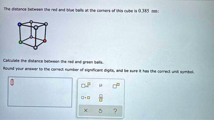 The distance between the red and blue balls at the corners of this cube Is 0.385 nm: Calculate the distance between the red and green balls_ Round vour answer to the correct number of significant digits, and be sure it has the correct unit symbol: D 0.0